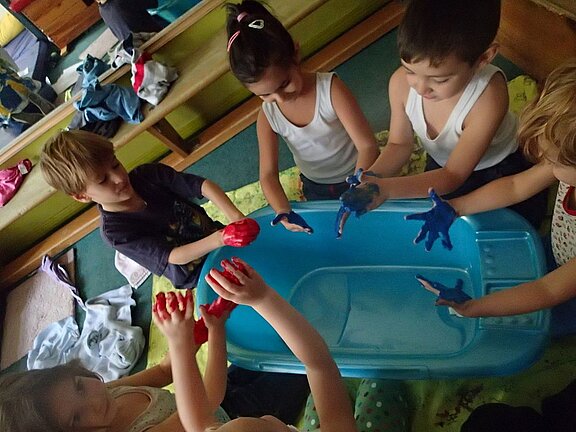 Baden mit einer Puppe, mit einem Auto, mit einem Buch. All das gibt es in der Kita. Beim Baden mit Buch entschieden die Kinder sich "trocken" zu baden zur Sicherheit für das Buch. Dafür gab es dann noch Kerzenlicht dazu.
