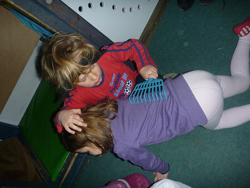 Baden mit einer Puppe, mit einem Auto, mit einem Buch. All das gibt es in der Kita. Beim Baden mit Buch entschieden die Kinder sich "trocken" zu baden zur Sicherheit für das Buch. Dafür gab es dann noch Kerzenlicht dazu.
